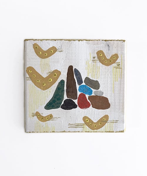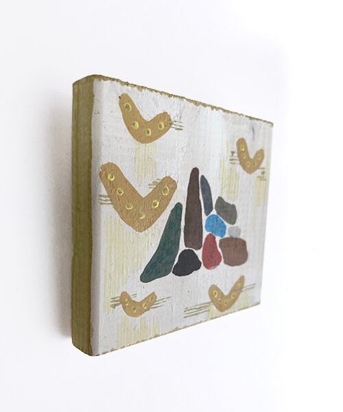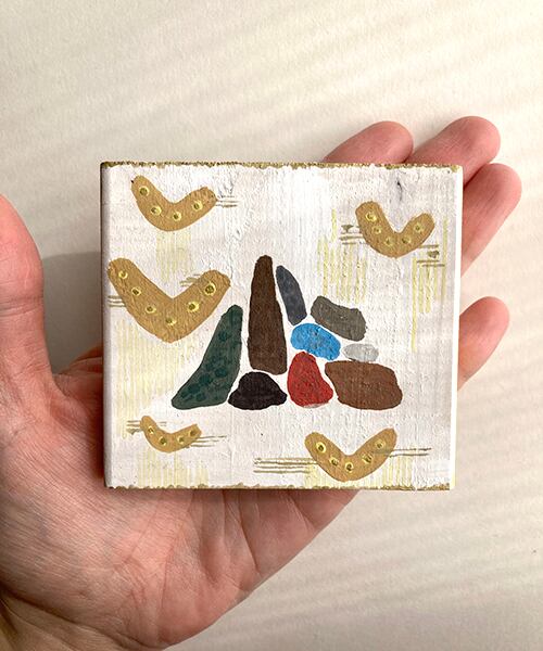 木片に、アクリル・水彩・パステルを重ねて描いています。