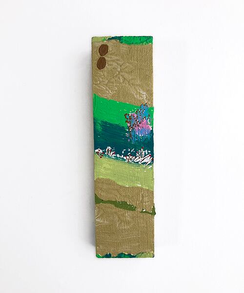 木片に、アクリル・水彩・パステルを重ねて描いています。