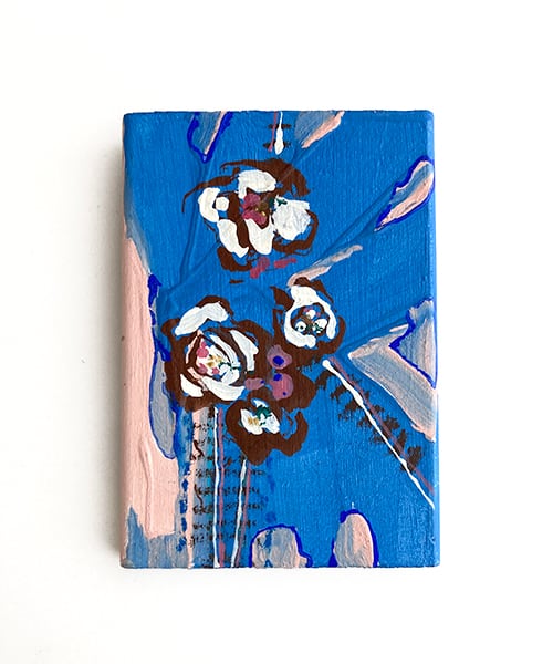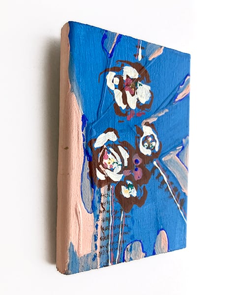 木片に、アクリル・水彩・パステルを重ねて描いています。