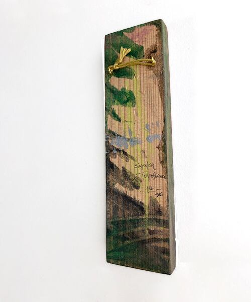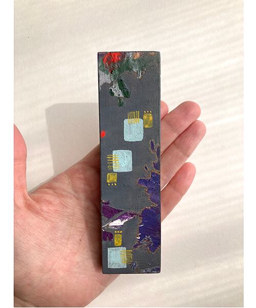 木片に、アクリル・水彩・パステルを重ねて描いています。