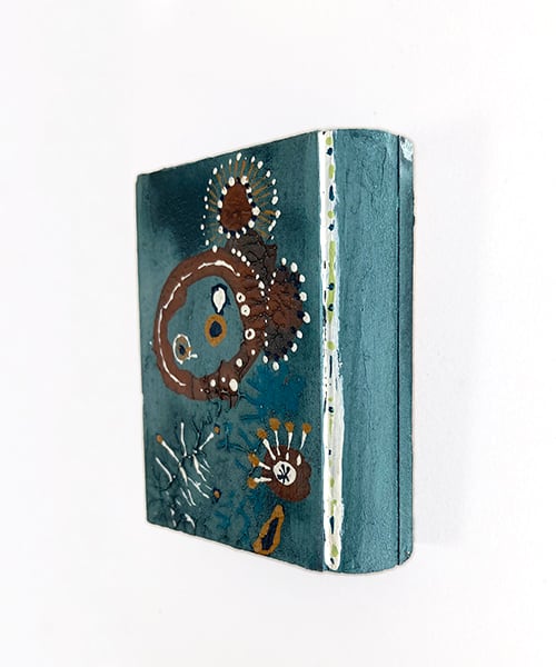 Created on wood with layers of acrylic, watercolor, and pastel.