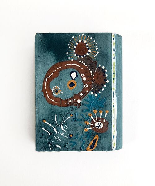 木片に、アクリル・水彩・パステルを重ねて描いています。